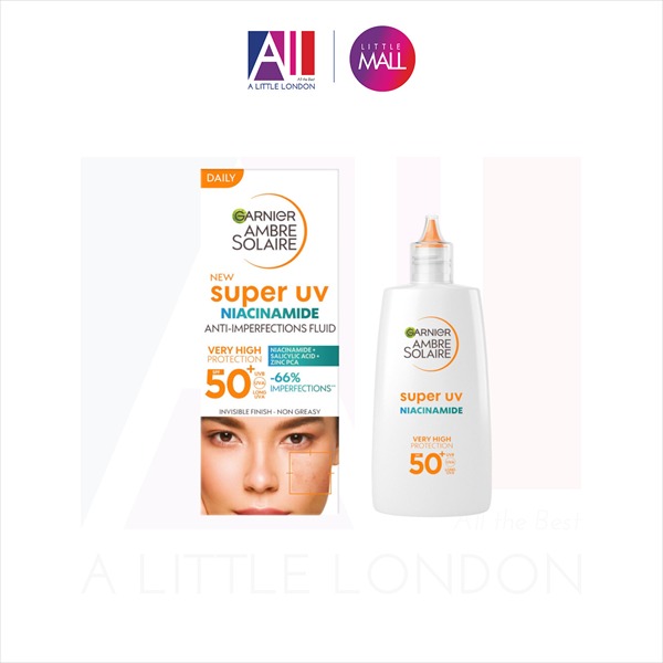 - Garnier Ambre Solaire Super UV Niacinamide anti-imperfections daily fluid SPF50+ được phát triển cho vùng mặt và được bào chế với 3,5% [Niacinamide + Salicylic Acid + Zinc PCA]. Công thức này giúp chống lại các khuyết điểm với hiệu ứng làm mờ trong 12 giờ*. Làm giảm sự xuất hiện của các khuyết điểm và thu nhỏ lỗ chân lông.