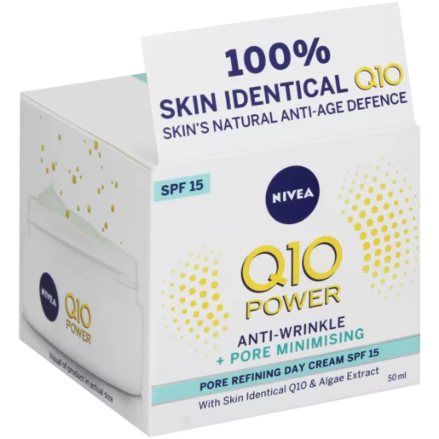 NIVEA Q10 Power Anti-Wrinkle + Pore Refine Day Cream chứa công thức được cấp bằng sáng chế sẽ đánh bay hiệu quả các vết chân chim cùng nếp nhăn, khiến làn da trở nên săn chắc hơn. Được phát triển đặc biệt dành cho da hỗn hợp, sản phẩm với chiết xuất tảo này sẽ làm thu nhỏ lỗ chân lông trên da. Khả năng chống nắng SPF 15 cùng tia UVA / UVB sẽ giúp bảo vệ da trước các yếu tố ánh nắng mặt trời và lão hóa sớm.