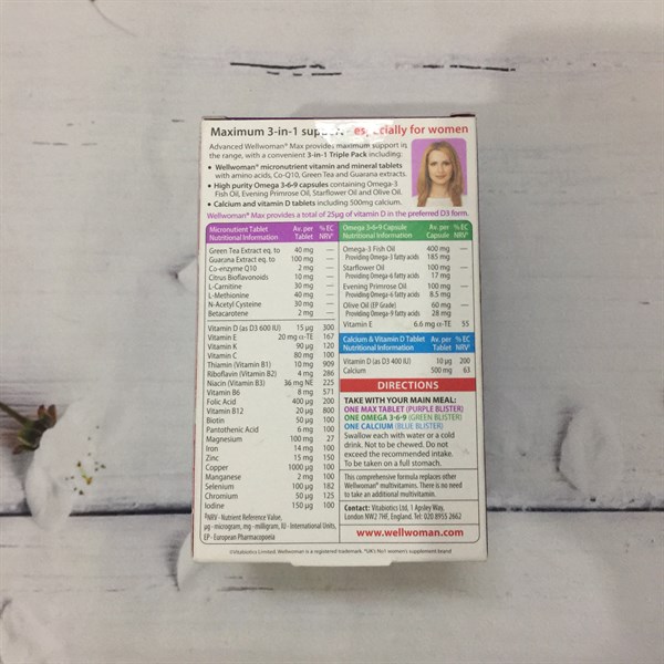 Bổ sung hàng ngày cuối cùng của chúng tôi dành cho phụ nữ. Bộ ba vitamin tổng hợp 3 trong 1 toàn diện hỗ trợ toàn diện cho các lĩnh vực chính của sức khỏe như năng lượng, hệ thống miễn dịch, nồng độ hormone và sức khỏe của xương. Wellwoman cũng là thương hiệu thực phẩm bổ sung dành cho phụ nữ số 1 của Vương quốc Anh.