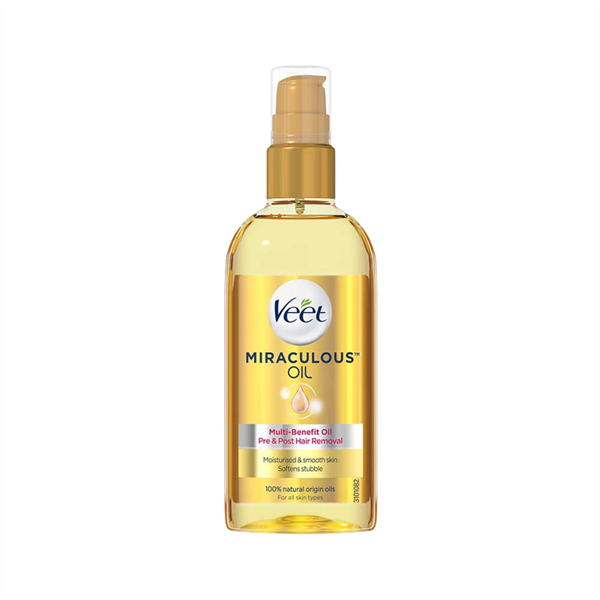 Dầu dưỡng trước và sau tẩy lông Veet Miraculous là sự pha trộn 100% dầu có nguồn gốc tự nhiên, giàu Vitamin và Omega 3, giúp da mềm mại và giữ ẩm suốt 24h.